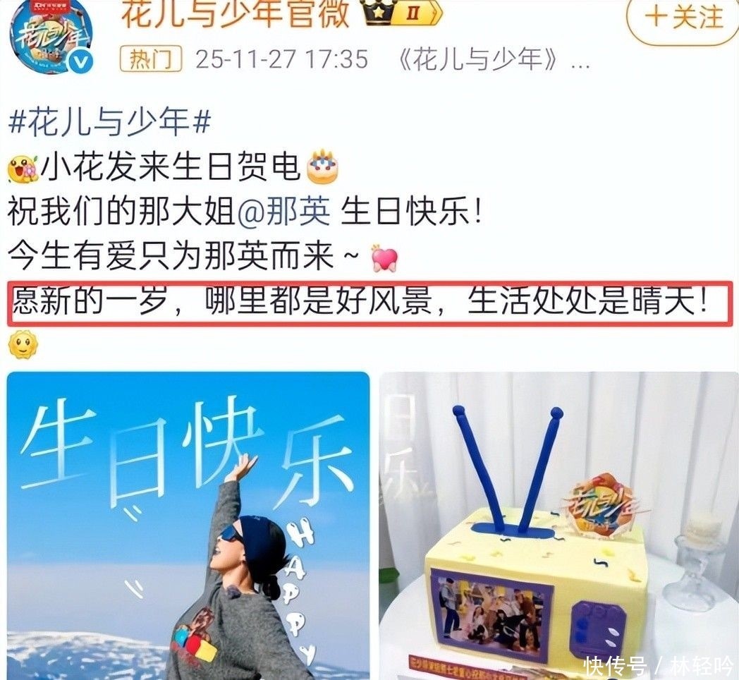 第一条来自《花儿与少年》官方微博,写道:“愿新的一岁,哪里都是好风景,生活处处是晴天。”