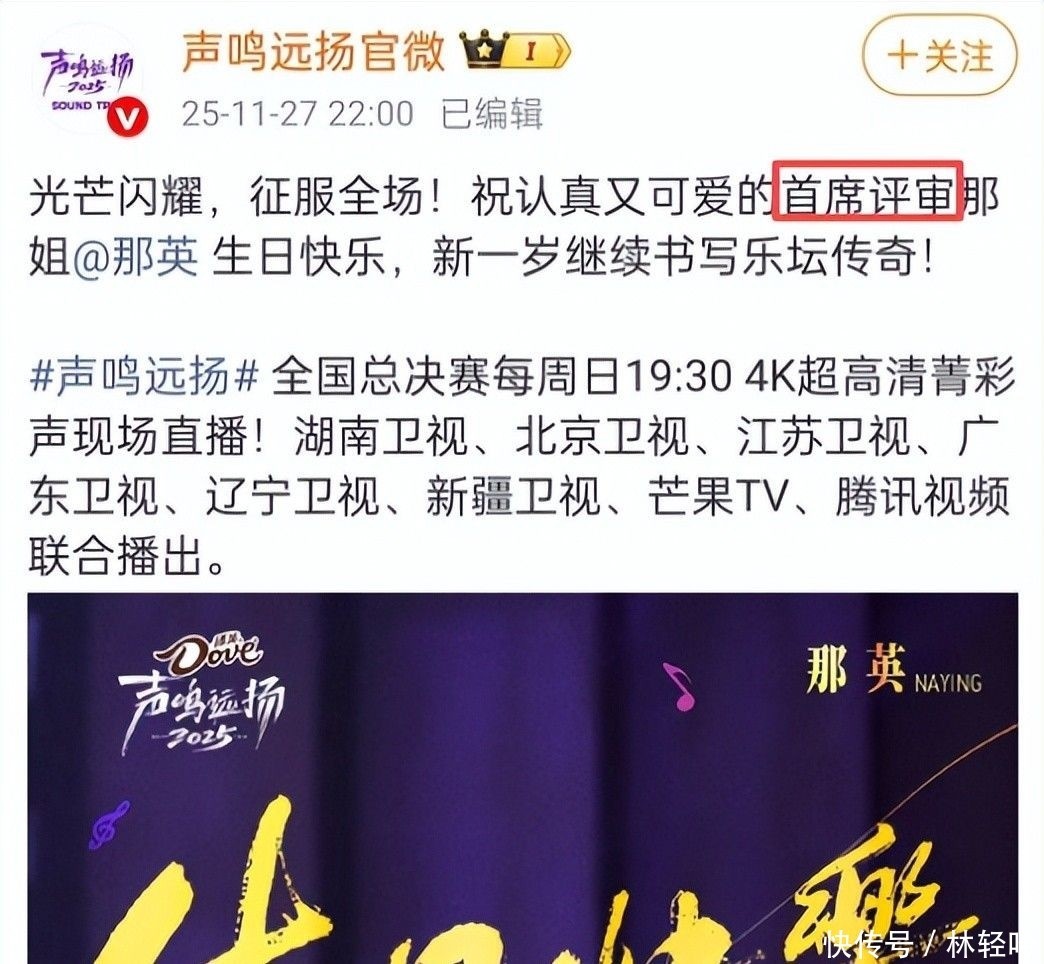 另一条重要祝福来自《声鸣远扬》官微,节目中明确肯定了那英在华语乐坛不可撼动的地位。